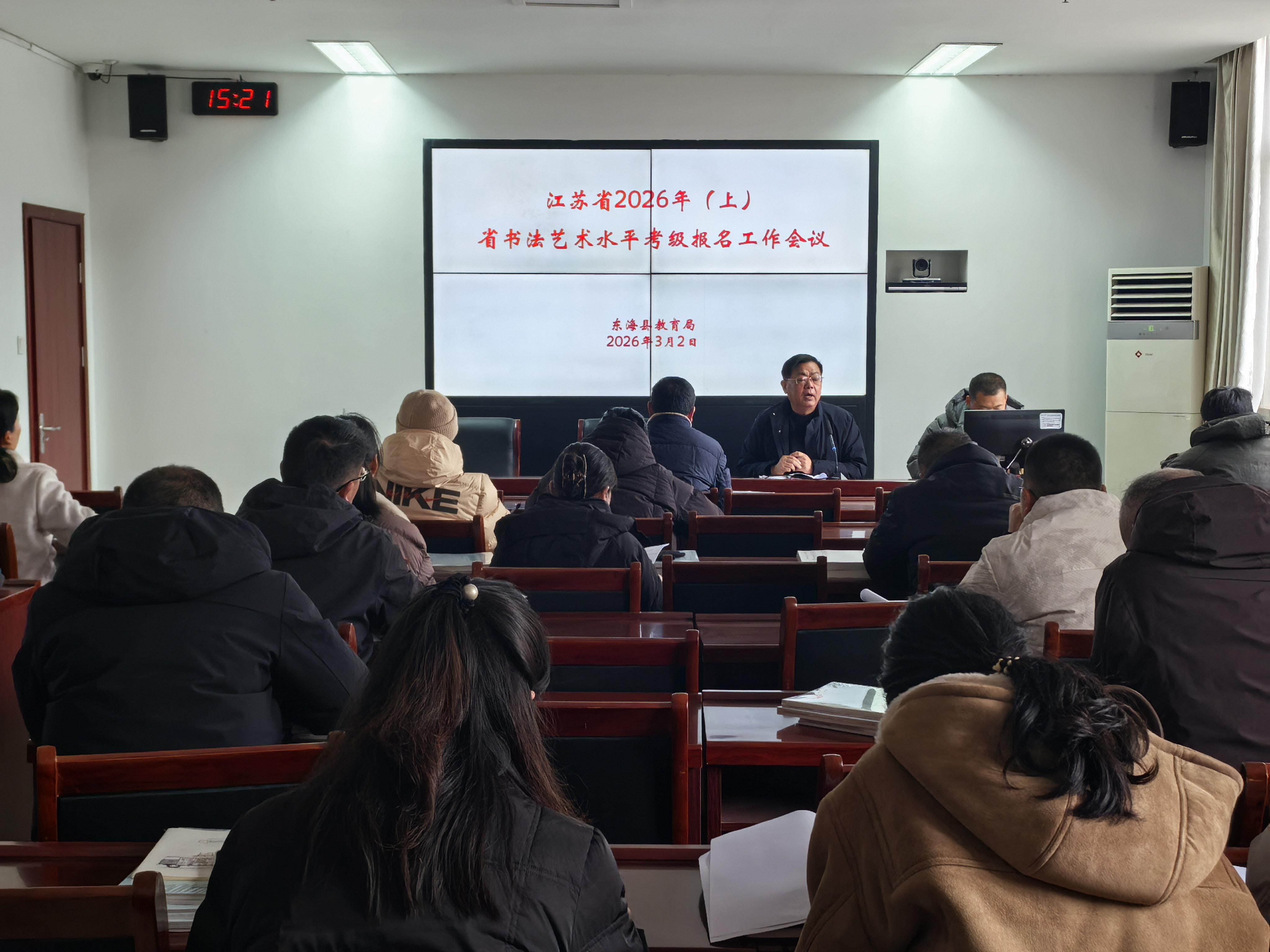 3月2日下午,东海县2026年上半年书法艺术水平考级报名工作会议顺利召开。县教育考试中心主任郇东林主持会议,全县各报名点分管负责人参会,共同部署考级报名相关工作。