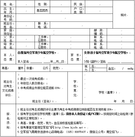 (二)学校推荐。主要由地方招生部门及中学负责,招生宣传动员后即组织实施。报考学生对照空军青少年航空学校招生基本条件(附件2)进行自愿报名。经班主任推荐后,所在中学对学生文化、现实表现情况逐一审查,并组织校医对学生身高、体重、视力、血压、色觉进行把关。符合条件者填写《空军青少年航空学校招生报名表》(附件3),由所在中学签署意见并盖章,经地市、县(区)招办审核后,作为推荐对象。